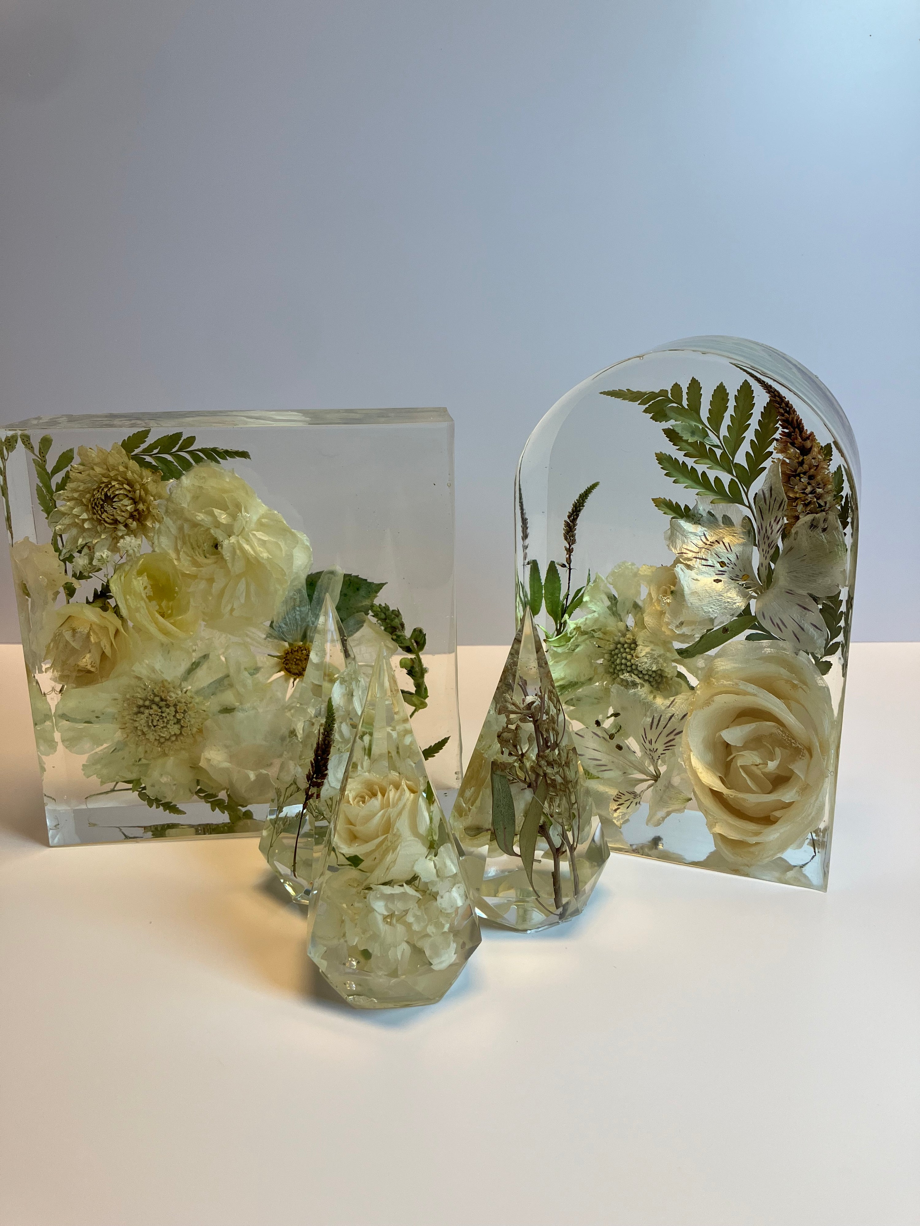 We preserve your wedding bouquets & other sentimental flowers forever. By placing your flowers in resin, they will be saved from the touch of time & become easy to clean home décor for everyone to see.