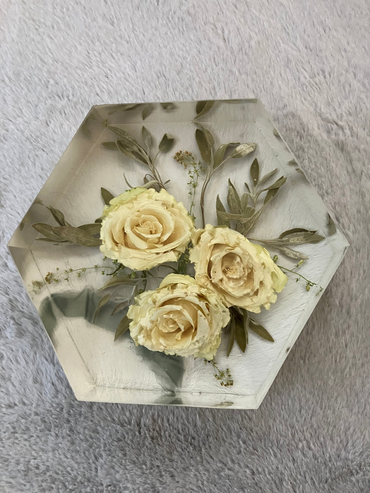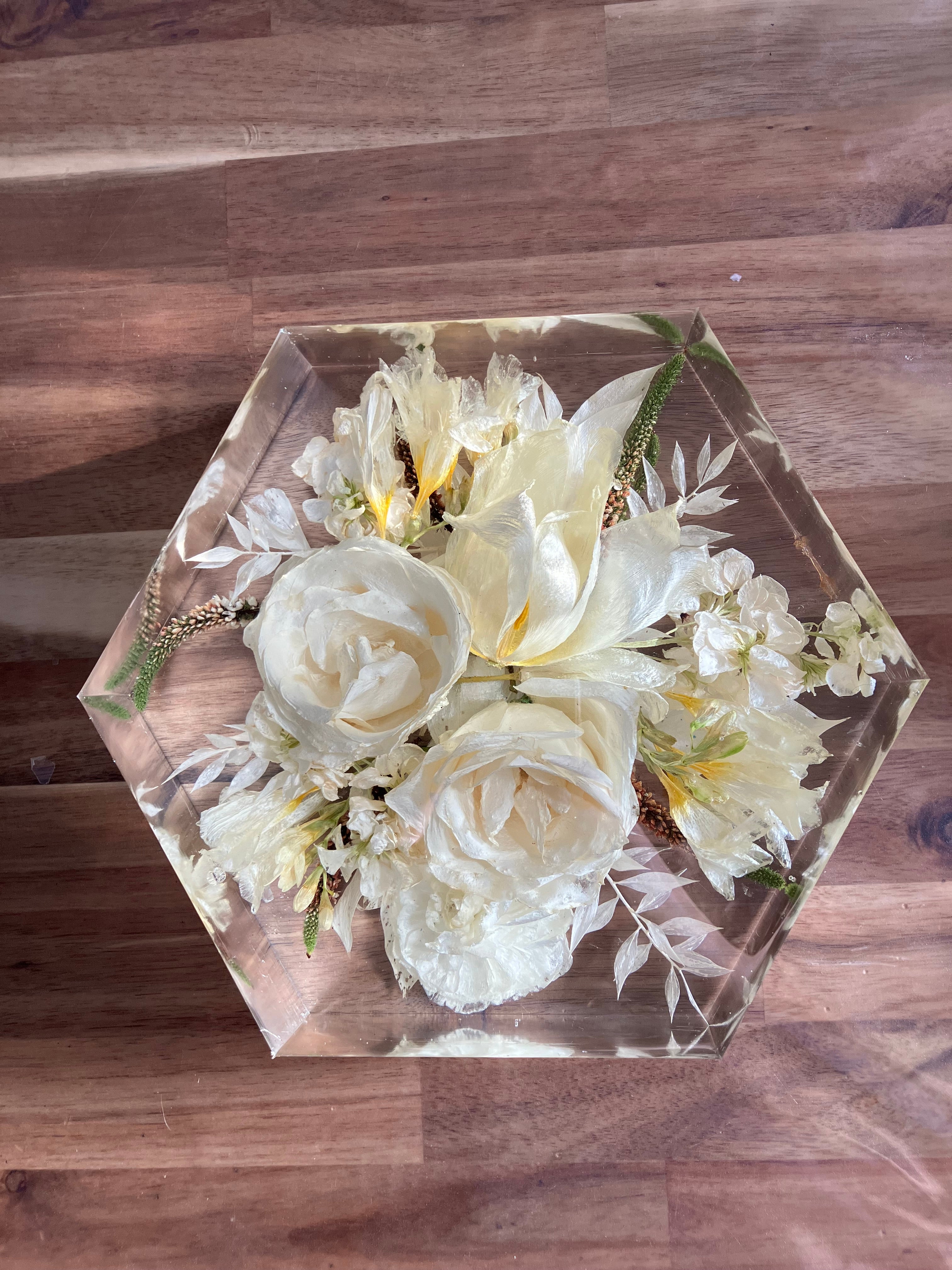 pieces can take anywhere from 3-5 months depending on the pieces ordered. Because it takes 2 weeks to dry fresh flowers upon arrival & each mold takes about 7-9 layers of resin that cure for 24-48 hrs. each. Resin work can be quite a long wait but we stay in touch throughout the process, so you will have an idea of when it will be finished.